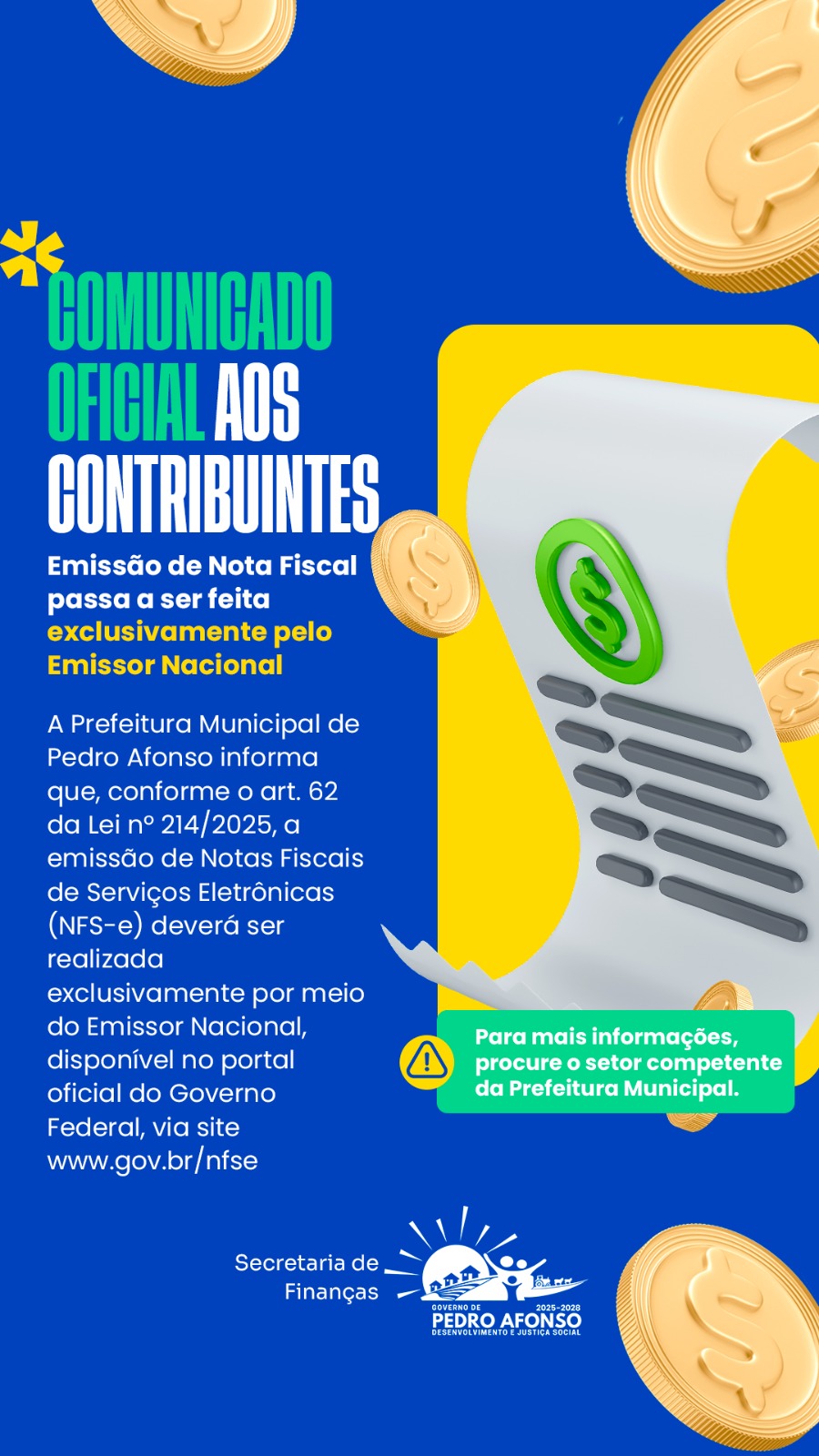 A Prefeitura Municipal de Pedro Afonso, por meio da Secretaria de Finanças, comunica a todos os contribuintes e prestadores de serviços do município que a emissão da Nota Fiscal de Serviço eletrônica (NFS-e) passou por uma mudança importante. Em conformidade com o Artigo 62 da Lei nº 214/2025, o faturamento deve ser realizado agora exclusivamente por meio do Emissor Nacional, hospedado no portal oficial do Governo Federal.