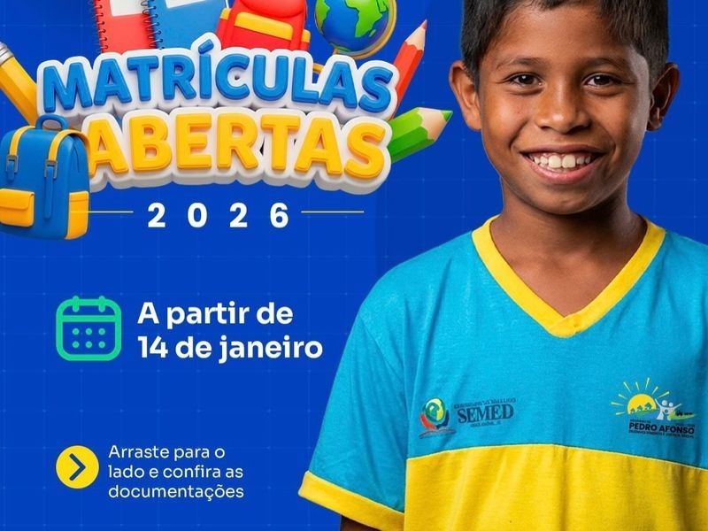 Atenção, comunidade escolar de Pedro Afonso! A Secretaria Municipal de Educação inicia, no próximo dia 14 de janeiro, o período de matrículas para o ano letivo de 2026. A gestão municipal reforça a importância de organizar a documentação com antecedência para agilizar o processo nas unidades escolares.