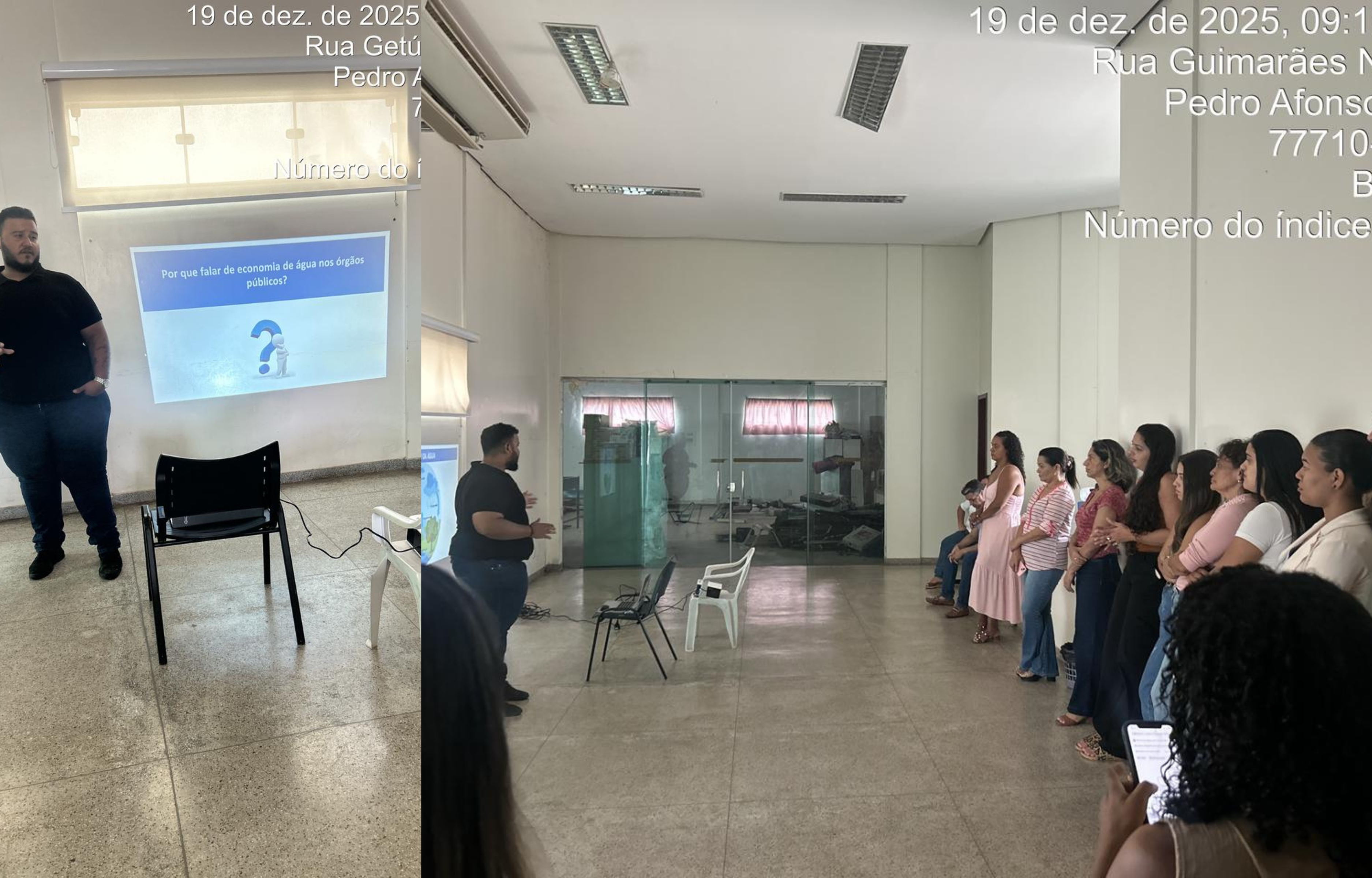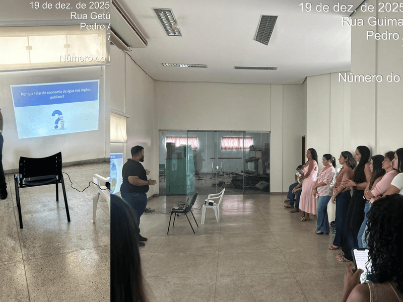 A ação consistiu na realização de uma palestra de sensibilização e capacitação dos servidores, com foco na economia de água na administração pública, abordando a importância do uso consciente desse recurso natural nos prédios públicos e nas atividades rotineiras do serviço público.