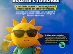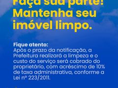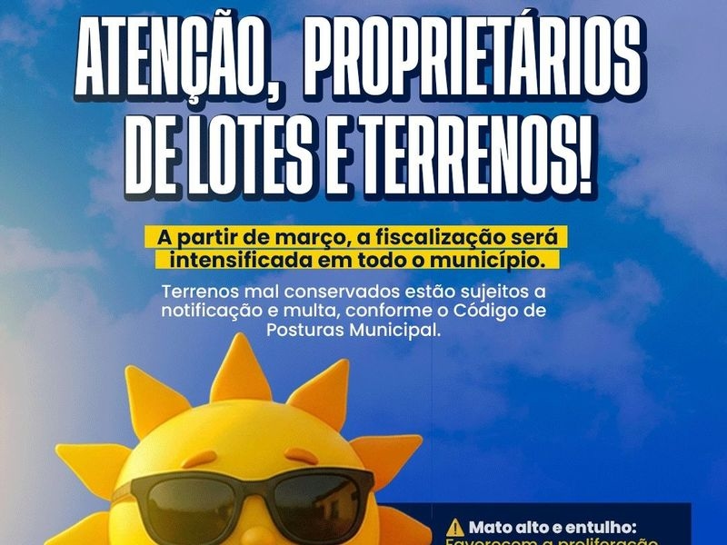 Terrenos que forem encontrados em mau estado de conservação, com mato alto ou acúmulo de lixo, serão devidamente notificados. Caso as providências de limpeza não sejam tomadas pelos proprietários após o aviso, estes estarão sujeitos à aplicação de multas, conforme a legislação vigente. A colaboração de todos é essencial para a manutenção da organização urbana.