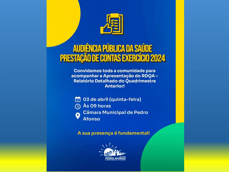 A Prefeitura de Pedro Afonso, por meio da Secretaria Municipal de Saúde, convoca a população para participar da Audiência Pública da Saúde, que será realizada no dia 03 de abril, às 09h, na Câmara Municipal de Pedro Afonso. O evento tem como objetivo principal apresentar a prestação de contas referente ao exercício de 2024, proporcionando um momento crucial para que os cidadãos acompanhem de perto os investimentos e as ações desenvolvidas na área da saúde no município.
